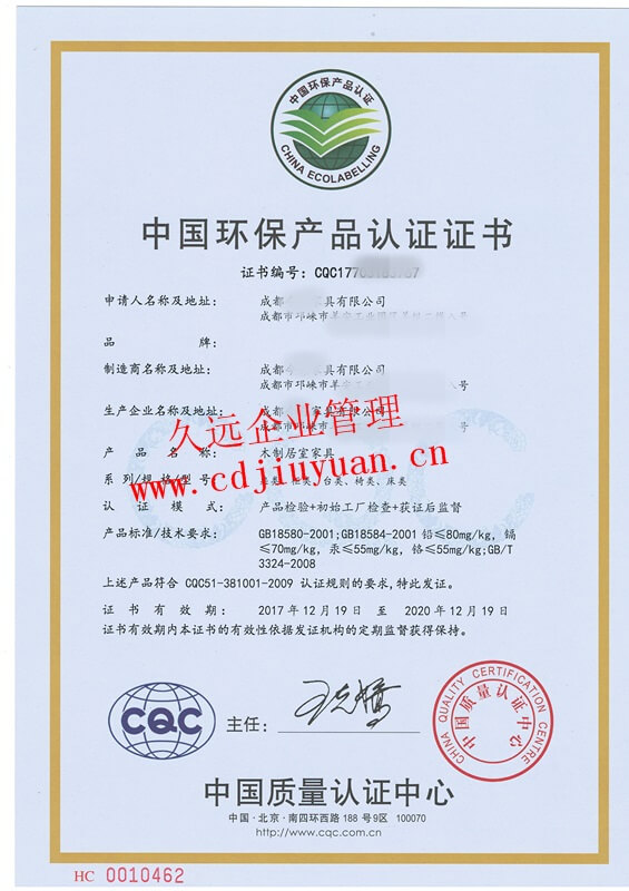 家具有害物質(zhì)限量認證證書
